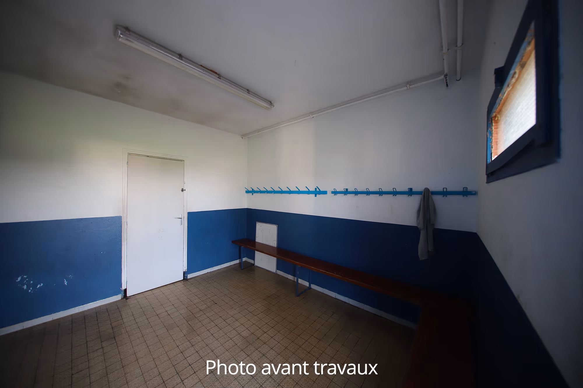 Le projet concerne la restructuration de vestiaires existants ainsi qu’une mise en accessibilité partielle des locaux. La distribution intérieure a été totalement modifiée, permettant de créer 4 vestiaires aux normes de la FFF dont un pour les PMR, un vestiaire pour les arbitres, des sanitaires pour les joueurs ainsi qu’un wc PMR à destination du public, attenant à la buvette. La façade a été radicalement transformée par la pose d’un enduit gris anthracite et de bardages bois verticaux pour une insertion adaptée au paysage environnant et au complexe sportif. En contraste, les peintures des locaux intérieurs apportent de la couleur et une distinction des locaux entre eux grâce à une colorimétrie choisie. La signalétique extérieure, à l’aide de grands numéros, facilite le repérage des usagers. La buvette a été harmonisée grâce à un volet rabattable et un store-banne gris anthracite.